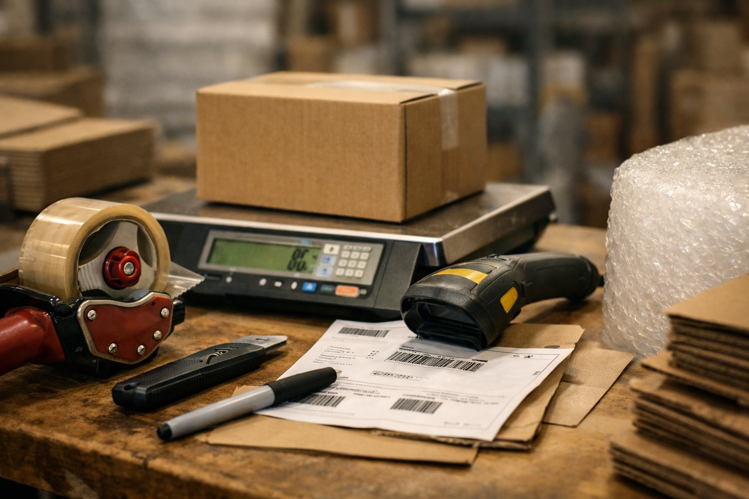 A fast station needs four items within one arm’s reach: tape, labels, void fill, and the top three cardboard boxes for shipping. Put printers on the same side as the scale—small move, real gain—and reserve bubble or kraft paper for fragile or heavy items, not every order.